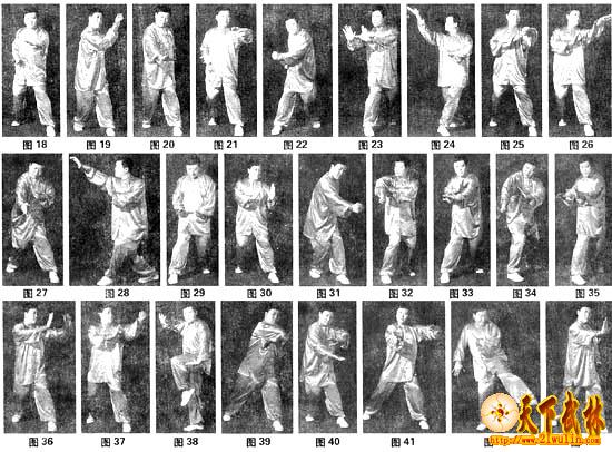 以上是无极逍遥拳第一段,第二段练法与第一段动作相反,只是左右手和左右脚的不同变化而已。但第一段练完后必须要回身,往回练习第二段,当第二段练习完毕后,才能回身练习上步三体式,方可收势。