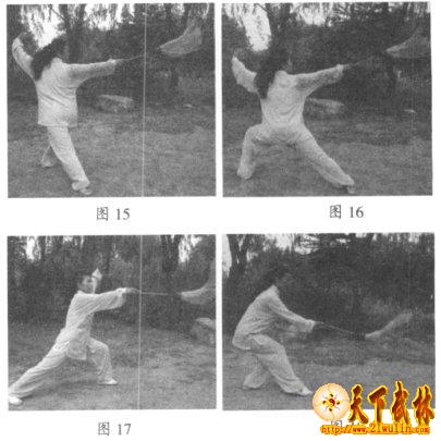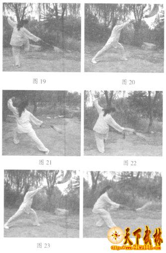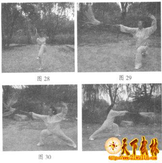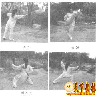 要点:三式为一组合,上步与撩击拂尘同时进行。身法步法配合协调,动作要流畅。尘身合一。