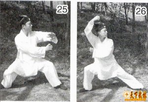 天津 郭树璞 马淑芬 郭云鹏 (接上期) 13、反劈华山 接上式,右脚向前进一步,脚尖外摆,屈膝呈右弓步,左腿自然伸直,上体略左倾的同时,右手拂尘继续朝下向右上再抡劈,停于右后侧,手臂自然伸直,拂尘略高于肩,手心朝内;左手掌向左上弧形运动,停于头部左上方,