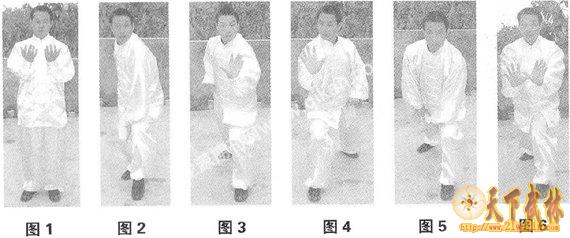 承上式,以头领身,重心前移;上右脚过左脚一步,随迫蹬左脚半步,成前膝弯套后膝弯的鸡步,在上步同时,右手向前上前推出,肘心必须向上为运动中坠肘,肩必沉,右手推到平眉不可过高,左手向左曳到左胯,肩必内扣,头顶颈直,目前视,三尖照,六六合(图3)。