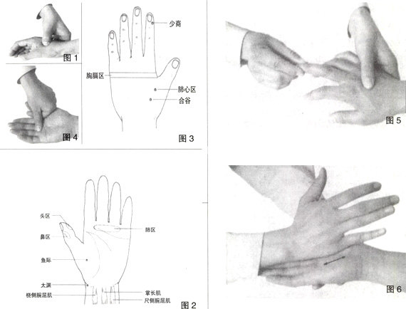 1、点穴:用拇指尖端掐点鱼际、合谷、太渊、商阳、头区、肺心穴,每穴行功1至3分钟,力达骨膜为佳(图1~图3)。