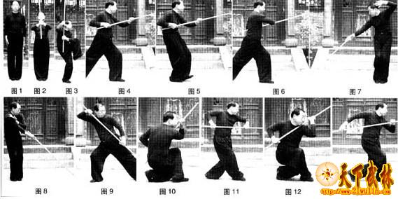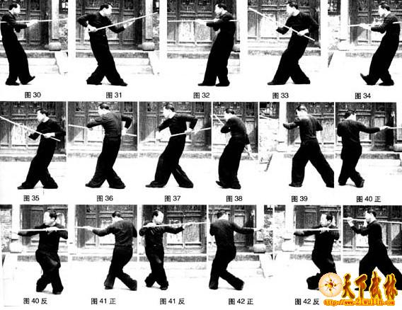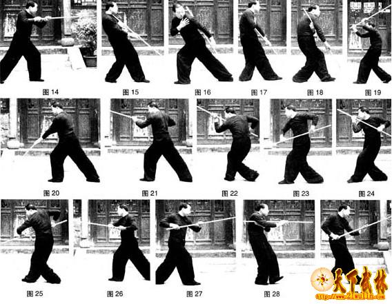 | 戴氏心意六合鞭杆,杆长以两手握杆轮换倒手十三把为其长度,鞭杆材质多为白蜡杆。鞭杆粗端称把,细端称梢。鞭杆两端皆用,可左右手互换,其诀有六字:劈、扫、戳、点、押、挑。同时,将刀、枪、剑、棍的许多劲道、技法及手、眼、身、步等融为一体,通过戴家拳独到的身法形成了身械合一、劲达鞭梢;进退自如、纵横交错;梢把兼使、左右互换;招势迅猛、攻防兼备;刚柔相济、快慢相间;起伏转折、快如闪电;点穴闭气、分筋错骨;变化莫测、袭人难防的风格特点。 注:在下面的技术动作分解中,右手持鞭杆把端部位,以下简称右手持杆,左手握鞭杆梢端部位,以下简称左手握杆。 技术动作图示分解如下: 第 一 节 1、预备势 左手握杆中端背于身体左侧后方,把端朝下,梢端朝上,右手五指并拢,掌心内扣,呈抱球状,自然垂于身体右侧(图1),含胸竖脊,顺项提顶,气沉丹田,静立片刻,随之,左手握杆手腕翻转鞭把朝上举于胸前,右手与左手交叉行抱拳礼,目视前方(图2)。 2、霸王举鞭 右脚向右侧横跨一步,左脚抬起置于右膝内侧,上身呈束身势,左手握杆上滑随左脚抬起由上向下拨杆上举于右胸前,右手接杆于头部右上方,头向左转,目视前方(图3)。承接上势,上身左转,左脚向前方踩出呈虎步,双手持鞭向前刺出,劲达鞭梢(图4);上动不停,右脚跟进一步,重心移于右腿,左脚置于右脚前呈左虚灵步,双手持鞭回抽于右腰侧(图5),随之,左脚向前进步踩出呈虎步,右手持杆前推抖杆横扫,鞭把不偏离中心线,左手握杆回拉于左腰侧(图6)。 3、前后双点 上身右后转180度,左脚向右脚并拢呈束身势,右手持杆,鞭杆梢端沿顺时针方向划弧经头部上方向右下方点击地面,左手外旋,手心朝上护于头部上方(图7);上动不停,身体左转180度,左脚向前迈进一步,右脚向左脚并拢,曲膝下蹲,含胸拨背呈束身势,左手由头部上方护于右肩前,右手持杆,鞭杆梢端沿逆时针方向划弧经头部上方向前下方点击地面,目视鞭梢(图8)。 4、虎步抽鞭 两脚蹬地旋起,上身右转90度,右脚向右侧前方迈进一步踩出呈虎步,右手持杆回抽,左手随右手持杆滑动,头向左后转,目视鞭杆梢端(图9)。 5、左右钮鞭 以两脚为轴,身体左转180度,随身体下势,右手持杆前推,左手握杆后拉在胸划拨,上动不停,两膝相扣,呈左地盘步,右手持杆在右胸前缠点,左手握杆回拉于左腰侧(图10)。承接上势,两脚蹬地旋起,右脚过左脚向前迈进一步,呈右半地盘交叉步,右手持杆回拉于右腰侧,左手握杆下押于右胸前(图11),随之,身体下势,呈右地盘步,左手握杆在左胸前缠点,右手持杆于右腰侧,目视前方(图12)。 6、串步穿鞭 两脚蹬地旋起,身体重心移于右腿,左脚过右脚向前迈进一步,右脚再过左脚向前迈进一步,双手持鞭回拉于右腰侧(图13),紧接,左脚过右脚向前迈进一步,,双手持鞭向前穿鞭,劲达鞭杆梢端,目视前方(图14)。 7、虎步扫鞭 右脚跟进一步,重心移于右腿,上身微后仰,左脚抬起向左前方迈进一步,右手持杆前推向左下方扫鞭,劲达鞭杆把端,左手握杆回拉于左胸前(图15)。 8、反侧撩鞭 左脚前寸一步,重心移于左腿,上身右后转180度,右脚向左脚后方倒插一步呈左虎步,左手握杆手腕翻转,鞭杆梢把颠倒,向后方撩鞭,劲达鞭杆梢端,右手护于左胸前,目视左后方(图16)。 9、盘龙鞭 以两脚为轴,身体右后转360度,双手持鞭随转身在身体两侧划弧拨转(图17);上动不停,重心移于右腿,左脚过右脚向前迈进一步呈左半地盘交叉步,右手持杆向左下方拨扫,左手握杆置于右腋下(图18)。 第 二 节 10、插花盖顶 以两脚为轴,身体向右后旋转180度,重心移于左腿,右脚过左脚向后方迈进一步呈左虎步,双手持鞭由下向上举过头顶(图19),上动不停,双手持鞭,向前向下劈点击地面,劲达鞭梢(图20)。 11、虎步扎鞭 右脚过左脚向前迈进一步,重心移于右腿,左脚抬起置于右膝内侧,上身束呈束身势,右手持杆后抽于右腰侧,左手前摸,双手持鞭于身体右侧,上动不停,左脚向前迈进一步踩出呈虎步,双手持鞭随展身向前扎出,与对方心口齐,劲达鞭梢,目视前方(图21)。 12、三角步挑鞭 身体重心移于左腿,右脚过左脚向前迈进一步呈右半地盘交叉步,随步行进,左手握杆,下押向前向上挑鞭,右手持杆于右腰侧(图22);上动不停,重心移于右腿,左脚过右脚向前迈进一步呈左半地盘交叉步,左手握杆回拉于左腰侧,右手持杆由右腰侧前推,杆把沿顺时针方向划弧向前向下押(图23)。紧接,重心移于左腿,右脚过左脚向前迈进一步,左手握杆上挑,右手持杆回拉于右腰侧。承接上势,重心移于右腿,左脚过右脚向前方迈进一步,随步行进,右手持杆向前向上挑鞭,左手握杆于左腰侧(图24);上动不停,重心移于左腿,右脚过左脚向前迈进一步呈右半地盘交叉步,右手持杆回拉于右腰侧,左手握杆由左腰侧前推,杆把沿顺时针方向划弧向前向下押(图25)。 13、旋转拦腰鞭 身体重心移于右腿,左脚过右脚向前迈进一步踩出呈虎步,右手持杆前推向前抖鞭,鞭把不偏离中心线,左手握杆回拉于左腰侧(图26);上动不停,以两脚为轴,身体右后旋转360度呈右虎步,右手持杆回拉于右腰侧,左手握杆前推向前抖鞭,鞭梢不偏离中心线(图27)。 14、前后押挑 身体重心移于右腿,左脚过右脚向前迈进一步,置于右脚前呈左虚灵步,左手握杆回拉于右腋下,右手持杆由右腰侧向前向下押鞭(图28);上动不停,重心移于左腿,右脚过左脚向前迈进一步,左手握杆随进步前挑,右手