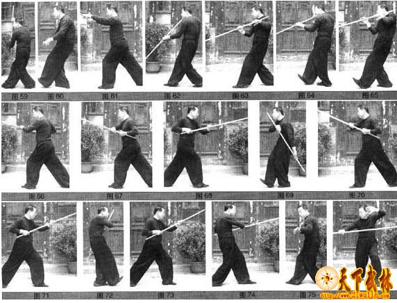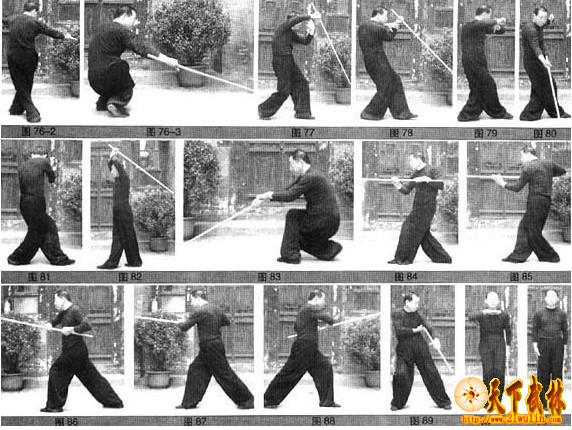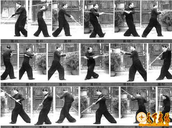 第三节 18、力劈华山 重心移于左腿,右脚过左脚向前迈进一步,右手持杆,鞭梢沿顺时针方向划一立圆向前向下劈点地面(图44);上动不停,重心移于右腿,左脚过右脚向前迈进一步,身体右后转360度,重心移于左腿,右脚向后退一步呈左虎步,双手持鞭随转身,鞭梢沿顺时针方向划一立圆于头部上方(图45),随之,双手持鞭由下向上向前向下劈点地面。目视鞭杆梢端(图46)。 19、左右背花 重心移于左腿,右脚过左脚向前迈进一步,左手握杆回拉于右腋下,右手持杆前推在胸前划拨(图47);紧接,重心移于右腿,左脚过右脚向左前方迈进一步踩出呈虎步,左手握杆向左上方击打,右手持杆于左腋下(图48-1、48-2)。上动不停,重心移于左腿,右脚过左脚向右前方迈进一步踩出呈虎步,双手持鞭在胸前划拨,右手持杆向右上方击打,左手握杆子右腋下(图49-1、49-2)。 20、喜鹊过枝 身体重心移于右腿,左脚过右脚向前迈进一步,双手持鞭在胸前划拨;重心移于左腿,右脚过左脚向前迈进一步;重心移于右腿,左脚再过右脚向前迈进一步踩出呈左虎步,左手握杆,鞭梢把颠倒,经左脚由里向外挑,右手持杆于左腋下(图50)。随之,上身右转90度,左脚过右脚向前迈进一步,重心移于左腿,右脚向前迈进一步踩出呈虎步,右手持杆,鞭梢把颠倒,经右脚由里向外挑,左手握杆于右腋下,目视前方(图51-1、51-2)。 21、进步划鞭 身体重心移于右腿,左脚过右脚向前迈进一步呈左半地盘交叉步,左手握杆回拉于左肩前,右手持杆在身体右侧沿逆时针方向划鞭于右腹前(图52);上动不停,重心移于左腿,右脚过左脚向前迈进一步,双手持鞭在身体两侧沿逆时针方向划鞭;左脚过右脚向前迈进一步踩出呈虎步,右手持杆,鞭把沿逆时针方向由下向上挑击,左手握杆回挂于左腰侧(图53)。 22、渔人划桨 身体重心移于右腿,左脚过右脚向后倒一步;重心移于左腿,右脚过左脚再向后倒一步,右手持杆,在身体右侧,鞭把沿顺时针方向立圆划鞭。上动不停,左脚过右脚向后倒一步,右手继续持鞭,在身体右侧,鞭把沿顺时针方向立圆划鞭。左手握杆随右手在左腰侧划动(图54)。 23、退步后扫 右脚过左脚向后撤退一步,重心移于右腿,左脚过右脚再向后退一步,右手持杆后拉,左手握杆前推,双手持鞭向右后下方扫击,目视鞭梢(图55)。 24、虎步击鞭 身体重心移于右腿,左脚过右脚向前迈进一步踩出呈虎步,右手持杆向左下方击打,左手握杆子左腰侧(图56)。重心移于左腿,右脚过左脚向右前方迈进一步,右手持杆回拉于右腰侧,左手握杆前推向右上方击打(图57)。 25、顺水推舟 身体重心移于右腿,左脚过右脚向左前方迈进一步,右手持杆向左下方拦格子左腹前,左手握杆回拉于头部左上方(图58);紧接,重心移左腿,右脚过左脚向右前方迈进一步,左手握杆向右下方拦格于右腹前,右手持杆回拉于头部右上方(图59)。上动不停,重心移于右腿,左脚过右脚向前迈进一步置于右脚前呈左虚灵步,双手持鞭横向收回丹田处,鞭杆梢把朝左右方向(图60)。承接上势,重心移于左腿,右脚前进一步与左脚并齐,随即抬起震脚,身体重心移于右腿,左脚向前迈进一步踩出呈虎步,双手持鞭由丹田处向前推出,高于胸前齐,劲达杆身,目视前方(图67)。 26、退步甩鞭 身体重心移于右腿,左脚过右脚向后退一步,双手持鞭,鞭梢把颠倒在身体两侧划弧拨鞭,(图62)。上动不停,右脚过左脚向后退一步,双手持鞭,鞭梢把颠倒在身体两侧划弧拨鞭。紧接,重心移于右腿,左脚过右脚向后退一步,双手持鞭,鞭梢把颠倒在身体两侧划弧拨;随之,右脚过左脚向后退一步,双手持鞭,鞭梢把颠倒在身体两侧划弧拨鞭(图63)。 27、进步甩鞭 身体重心移于右腿,左脚向前进一步,双手持鞭,鞭梢把颠倒在身体两侧沿逆时针方向划弧拨鞭(图64)。上动不停,右脚过左脚向前进一步,双手持鞭,鞭梢把颠倒沿逆时针方向在身体两侧划弧拨鞭(图65)。 第四节 28、左右横击 身体重心移于右腿,左脚过右脚向前迈进一步踩出呈虎步,右手持杆回拉于右腰侧,左手握杆前推向前横击,鞭梢不偏离中心线{图66)。上动不停,右手持杆前推向前横击,鞭把不偏离中心线,左手握杆回拉于左腰侧(图67)。 29、进步左右扫 以两脚为轴,身体右后转360度,呈右虎步;右手持杆,随转身横扫一周于右腰侧。左手握杆前推,劲达鞭梢,鞭梢不偏离中心线(图68)。上动不停,重心移于右腿,左脚过右脚向前迈进一步踩出呈虎步,左手握杆回拉于左腰侧,右手持杆前推向前横扫,劲达鞭把,鞭把不偏离中心线。承接上势,如此循环六次。 30、虎步前后点 以两脚为轴,身体右后转180度,身体重心移于左腿,右脚置于左脚前呈右虚灵步;随转身,双手持鞭于身体左侧(图69)。上动不停,右脚向前踩出呈虎步,双手持鞭向前点击(图70)。紧接,左后转180度,重心移于右腿,左脚向前踩出呈虎步,双手持鞭向前点击(图71)。承接上势,以两脚为轴,身体右后转180度,重心移于左腿,右脚置于左脚前呈右虚灵步;随转身,双手持鞭于身体左侧(图72)。右脚向前迈进一步,左脚过右脚向前踩出呈虎步,双手持鞭向前点击(图73)。原步不动,右手持杆回拉于右腰侧,左手握杆前推横击,劲达鞭梢,鞭梢不偏离中心线(图74)。 31、地盘旋鞭 身体重心移于左腿,右后转180度,右脚向后退一步,左手握杆,随身体旋转向前横扫,右手持杆回拉于右腰侧(图75)。紧接,重心移于左腿,右脚过左脚向前迈进一步,身体向右后旋转360度呈右地盘步;右手持杆随