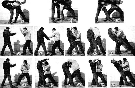 七、敌我双方相对站立(图26),对方以前手直拳向我头部打来。我方迅速潜身闪躲来拳,同时以后脚蹬地发力催动前脚快速进步,带动身体前冲,同时以右前臂向上发力挑击对方出拳手臂后端(图27),右手顺势向下抓捋对方右臂,同时以左手栽拳向下发力猛击对方头部一侧(图28)。继续进步,同时以右臂屈肘发力挑击对方下颌(图29),右手挑肘击打后,顺势向下发力以掌击打对方面部(图30)。
