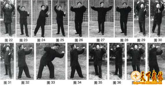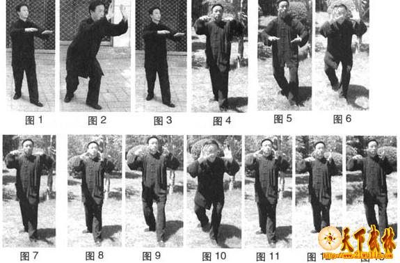 站立的姿势同独立桩相同。意念假借我们身如巨人,怀抱一棵参天大树,身体与大树融为一体。臀部似坐在树干上。大腿、小腿、后腰、背、颈部部似与大树融为一体。站立说应感觉到非常的平稳。头与左脚似有弹簧微微上下相争,头与抬起的右脚踝部似有弹簧上下斜面相争,右脚掌底部似踩着一根粗大的弹簧,左胯与右前膝似有弹簧左右前后微微相争。意念假借调整好后,开始练习左脚的蹬踏发力。首先左脚下踩,微向前蹬、上站,催动身体微微向前,向上。身体猛然微向后靠,似有挤靠大树的相争之力。这时右脚右腿猛然向下,微向前蹬,微向内挤合,用右脚掌横向的内掌缘部,似有蹬踏对手的前腿膝部及膝部以下的迎面骨,要有蹬断踏碎对手的前腿之意。右脚右腿发力时,头与左脚似把上下相系的弹簧猛然拉断,头与右脚踝部上下斜面相争的弹簧猛然拉断,右脚掌在蹬踏时,意有把脚掌下粗大的 弹簧猛然踩进地里之意。左后胯也同时配合把右前腿膝部前后、左右相系的弹簧猛然的拉断。右脚在向下向前蹬踏发力时,脚掌不要踩地,大约离地十公分左右。一发即止,身体重心,手形姿势仍回到起式时的姿势,右式的发力式与左式发力原则要领相同。(见图51-54)