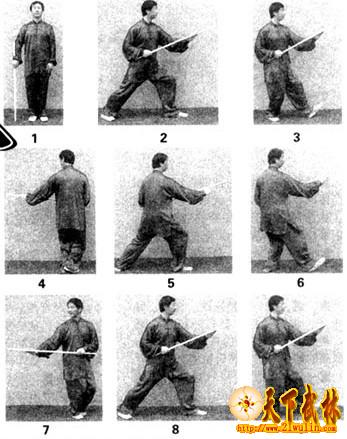 4.左戳。重心后移成坐步(图6)。左脚上步收于右脚旁成丁虚步,同时右手松握鞭向上向后弧形运行至身体右后侧,高与腰平,目视鞭梢(图7)。左脚上步成左弓步,同时两手持鞭向前戳出,鞭把高胸平。右手实握贴于右腰侧,左手松握,目视前方(图8)。
