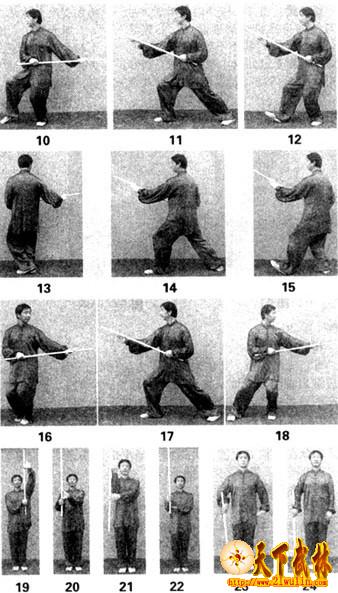 8.收式。身体向左转向左戳,右手变正握把段,目视左前方(图18)。左脚收并于右脚旁,两腿伸直,同时左手松握鞭上举,右手实握贴于左腰侧,目视前方(图19)。右手握鞭前伸,左手推在右手握鞭处上端,目视前方(图20)。右手松握鞭,在身体右侧向前舞鞭花,鞭梢端着地,目视前方(图21,22,23,24)。