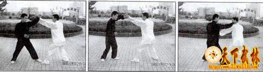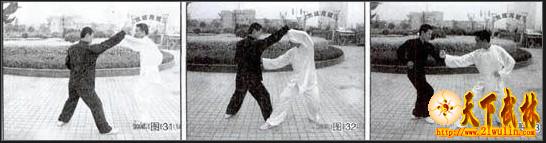 三、甲:反背劈捶乙:滚磕斩劈手 甲:紧接上式,甲见撩阴拳被对方下磕顾,立即将左拳由下往回抽至胸前时,以左反臂劈捶式,由胸前向前上方,向对方的面门劈砸,左臂微屈,拳心向上,力达左拳背;右掌握拳屈臂护于胸前,拳心向里,拳背朝外,右拳贴于左肋旁,目视对方面部(图8) 乙:紧接上式,乙见对方左拳又奔面门劈砸而来,急将左臂由下向上外旋,滚磕对方的左小臂,使两小臂相交,右掌仍伏按于脐旁,目视对方面部(图8)。 上动不停,乙立即将左脚回撤至右脚旁,右脚迅速向前迈进一步于对方左脚外侧(此称活步法),下体仍保持三体式姿势;同时,左拳变掌,借左脚撤步之势,手腕内旋翻住掳带对方的左腕,将对方左臂往自己左下侧捋带;右掌亦同时借右脚进步之势,迅速向对方左颈部斩劈,力达右掌外缘,目视对方面部(图9)。 注意要点:甲:反臂劈捶时,速度要快,劲力要猛,要借对方下磕顾之力,顺势翻转劈砸,亦可身体稍往上耸以助其势,要力达左拳背面,且要与上动撩阴连贯协调,一气呵成方妙。乙:左臂滚磕要有拧旋翻转之意,以系旋力化解对方的劲力,并可顺势行化,切不可硬接硬架,以免手臂受伤,左脚后撤,右脚进步,增加到技法法剖析里面,此乃实战中非常有用的步法,称为活步法,当可以通过步法的灵活转化,从而改变自己的身体优劣势,变被动为主动,以形成人背我顺之势,且可以在步法转换过程中,相化对方的劲力,从而进攻对方的弱环节。活步时速度要快,要使对方不易察觉,左手掳带要准确有力,右掌斩劈要迅猛有力。整个动作须手法相顾,步法灵活巧妙,所谓:手随身进节节贯通,快速有力力贯四稍;滚磕斩劈,崩打连环;左右往复,疾上加急。 技法剖析:甲:反臂劈捶势外领旋坏对方的重心,从而以达制敌之目的,如对方左臂滚磕后,立即旋腕掳带对方左腕,左脚后撤,右掌按压对方左肘关节,或以右肘滚挫对方的左臂将对方制服,亦可左手掳带,右带击打对方左肩背后部或其左肋部,或击打对方左胯侧,均可将对方重创,此式亦可用左拳反打对方的左耳部以单风贯耳法击之,亦可用左单写拳冲打对方头面部均可。拳经云:朝上顶头顶如托,反背捶疾若旋风;目张声耸丹气抱,河图洛书九九重。乙方之技法亦非常玄妙,充分体现了形意门,有力进中门,无力两边分之技法特点。(将前页中的内容加此)我左脚后撤的同时,左手掳带其左腕,右手顺势抓扣对方肘部,双手借撤步之势,将对方左臂往自己左下侧捋带,使对方前仆,此即顺手牵羊,如果将对方左臂往自己左脚下牵带,使对方前仆,此即千金坠地。亦可不用活步法,左掌将对方左腕下牵带,右脚直接进步于对方腿后,左转体,以右掌劈砸对左臂,顺势以左臂向对方胸部撇靠,将对方摔出。拳谱所谓:前手捋,后手带,上下左右任施为;左崩锤,右反背,撩阴一脚命归西。 四、甲:坐马炮打乙:叶底藏花(拗步右崩拳) 甲:紧接上式,甲见左臂被掳带,对方右掌又奔自己颈部劈来,急将左腿往回撤步,右脚顺势向前微进步逼进对方,身势微坐,左转体成左半马步势;同时,借撤步之势,左手向上钻穿解脱对方按压,并手腕内旋刁拿对方右手腕,向左后上方领带,拳心朝外;右手握拳亦同时借左转体拧腰转胯之势,迅猛速向前击打对方的右肋部,拳心朝左,力达右拳轮,目视对方面部(图10、11)。 乙:紧接上式,乙见自己右掌被对方刁拿,对方右拳又奔自己右肋击来,急忙含胸收腹,身体往后急缩以闪避对方的攻势;同时,左掌急忙由胸前向前托截对方的右肘部,并顺势往自己右侧方捋带,掌心朝上,掌指朝前,右掌亦随缩身之势,拧旋解脱对方的刁拿回收于胸前,目视对方面部(图12)。 上动不停,乙借含胸收腹缩身之际,急将右脚回抽绕过向对方右脚外侧,以同时化解对方的攻势;左脚迅速向前迈进一步,下体仍保持三体式步势;同时,左掌继续将对方右臂往自己右外侧捋领托带,右掌变拳借进步进身拧腰转胯之势,迅速以右崩拳向前击打对方的右肋部,拳心朝左拳眼朝上,力达右拳轮,目视对方面部(图13)。 注意要点:甲:左脚回撤,右脚前进应快速灵活,保持身体平稳,且左手钻穿刁拿要稳、准、快,要和左脚撤步同时进行,并要有领带之意以破坏对方重心,右脚进步与右拳打要手脚相顾气力合一方可马到功成。 乙:含胸收腹,右脚绕步要把握时机,准确及时,不过过早与过迟;左手托截捋带要准、快、稳、且要一粘即托即扣拿对方肘部,控制对方中节;左脚进步与右崩拳击打要借拧腰转胯之势,快速有力,劲猛势雄,脚到手到,一气呵成主妙。 整个动作,甲、乙双方须配合自然巧妙,不可妄用僵滞之力而误伤对方。此动手眼身法步要求高度协调,方保无虞。 技法剖析:甲之技法利用了步法的灵活转化变被动为主动,是一种顾打相合技法的综合运用,形意拳实战讲究,顾中打、打中顾、顾打相合无敌家,进中退、退中进、进退活变多玄妙。此技法是炮拳的变式故称坐马炮打。坐马炮打在实战运用中不但可以攻打对方肋部,而且上可打头面,中可打心窝膻中,下可打撩阴高骨,这是其上、中、下三路的基本变化,而在实战中往往前辈先贤根据环境不同,右拳崩打对方的右大腿根部可将对方击倒坐地,冲打对方的右膝弯部可将对方击侧跌,而且其中跌打擒摔变化非常玄妙,这也许是对九拳秘不外传的主要原因吧。拳经云:霸王出军开大弓,阴阳齐进动静分;大喝一声猛拉弓,弦断弓折两片分。 乙之技法变化是采用了形意门中独特的盘根步法(这