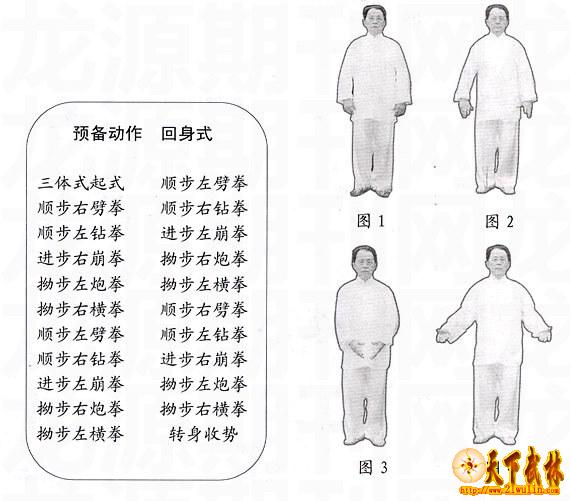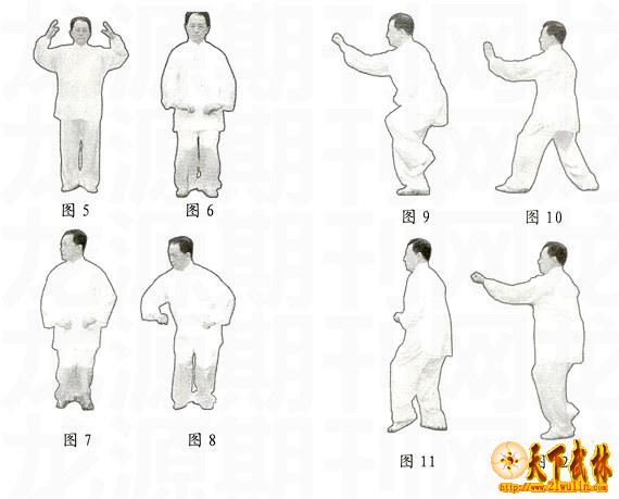 三体式起式 三体式,又名三才式,俗称桩法,是形意拳开门式的姿势。习练各拳必须先由三体式开始,再行变化。 1、从预备式两肩下垂引气到手(图2),然后两手心相对,向丹田合气(图3),然后再翻转手心向上,从左右两侧屈臂平行向上托起(图4)。掌托至与下颏平时,翻转臂腕,掌心向下(图5),十指相对,在胸前由掌变拳,拳心向下,屈肘向下按劲,按至小腹丹田处,两肩极力下沉,两肘向前扣劲,小腹鼓气的同时,腰随之向下沉,两腿靠拢,两膝靠紧,屈膝下蹲,丹田往后吸劲(图6),头向右转并顶劲,项要竖劲,二目平视前方(图7)。 2、紧接上式,上身原地先向右,再向左旋转活动腰胯,速回向右转身(图8)。当身右转时,右脚提起向右在原地出半步震脚,脚尖斜向右前方,呈斜横步,身上起,左脚紧跟提起靠在右小腿内侧,脚尖向下呈鸡形步的同时,两拳随转体右拳向左,左拳向右,在腹前交叉划弧。然后,右拳扭转,拳心向上,在左拳上方经胸前向前上方钻出,高与鼻口之间,不可过鼻。手背向下,极力向里裹劲至小指朝上。臂与肩平,肘微屈下垂,两肩扣劲。左拳向下按,拳心向下,落至脐部后方,左肘紧贴左肋,头要顶劲,项要竖劲,目光平视前方(图9)。 3、紧接上式,左脚向前踏出一步,落地要顺直,脚趾抓地。右脚尖随之稍向外展,两脚前后距离一般二尺五寸。两腿仍屈膝,似直非直,似曲非曲,身体看正是斜,看斜是正。前后两脚的劲力,为前三后七,其重心落在后脚至前脚之间的三分之一处。同时,左拳由脐后经胸前向右上斜出。当与右拳呈交叉时,迅速扭转臂腕,两拳放开变掌呈“三圆掌”,左掌由上向前向下翻落劈出如斧之劈物,肘部微曲,掌心斜向前下方,五指自然分开。虎口要圆,中指竖劲,掌心内含,高与心齐,左掌与左足上下相照,手与肩平。右掌向外拧劲,由上向下向里,肘贴肋向后撕捋,靠在脐之右侧。掌心向下,手背向上,五指分开如抓圆球,手腕向下塌劲,手指向上竖劲。两手之劲左推右捋,如同抽丝。头要顶劲,项要竖劲,舌尖抵上腭,两肩要扣,两眼平视左掌前方,势动如鹰,不动如熊(图10)。 第一式 顺步右劈拳 1、在三体式预备式基础上,左掌五指微曲,小臂外旋,由前向下朝里坠肘贴肋回拉至脐左侧变握拳的同时,右掌随之外旋回拉变拳,停于脐右侧。当两拳旋转回拉时,左脚同时撤步回收靠于右脚内踝,脚尖点地,左膝靠右膝内侧,目光平视前方(图11)。 2、紧接上式,左拳在脐前向上提起,小臂向左转,使拳心向上,经左肋左乳至下颏,斜向前上方拧转钻出,高不过眉,拳心斜向外,拳眼向上与左肩呈水平,沉肩坠肘,臂微曲,与前动作连贯呈一大圆。右拳随左拳向上提时在脐右,拳向外拧,拳心向上,随左钻屈臂拳向上提,由脐至胸口向左上方斜出,置于左臂肘内侧,蓄意向前劈的同时,左脚向前偏左蹚进踩落半步,左脚呈斜横步,微屈膝,右脚遂向前提起,靠在左腿内铡,紧贴于左小腿上,脚尖向下呈鸡形步。两腿似直非直,似弯非弯,头要顶劲,项要竖劲,目光平视前方(图12)。 3、紧接上式,右脚向前迈一大步踩实,膝微曲,脚尖向前微里扣。左脚随之向前跟进垫半步,身体重心后移坐于左腿呈桩步,两腿似直非直,似弯非弯的同时,右拳小臂外旋,从左小臂脉窝处变掌向前立掌刚劲劈出,高与眉心相对,掌心斜向左,五指分开,虎口要圆,与右肩呈水平,臂微屈,沉肩坠肘,由阳拳变阴掌。左拳向右扭转臂腕,将拳松开变掌向下回拉捋劲下按至脐左侧。五指分开,手心向下,虎口要圆,大拇指靠腹部,两肩扣劲,丹田抱劲,头要顶劲,项要竖劲,目光平视前方。两拳往返刚中求柔,不可用拙劲(图13)。 第二式 顺步左钻拳 1、紧接上式,右脚向前迈进半步,脚尖斜向右呈横步的同时,右掌向外翻转臂腕变平掌,掌心向上,用手指向前平穿。左脚在后随跟进紧贴于右小腿内侧,两腿微曲呈鸡形步的同时,左掌在脐前变拳拧转,拳心向上,向胸前提起置于右肱肘内侧,两肩扣劲,丹田抱劲。头要顶劲,项要竖劲,目光平视前方(图14)。 2、紧接上式,右臂屈肘向里拧转,掌变刁手向左向下刁挂,随之握拳,拳心向下,由上往下落翻,顺左臂外肘捋回至脐部,拳背朝上,拳虎口紧靠脐。同时,左拳向外拧,小臂向里裹劲,至拳心向上再顺右小臂脉窝上与右掌相摩擦。拳从口出向前钻起,虎口向上,拳背向右,小指向上,拳高不过眉,与左肩平,臂微曲,沉肩坠肘。同时,左脚向前迈进一步踩落,脚尖直向前方,右脚随即跟进垫半步,两腿微曲呈桩步。两肩要扣,丹田要抱劲,头要顶劲,项要竖劲,目光平视前方(图15)。 第三式 进步右崩拳 1、紧接上式,左拳向里屈肘拧转扣腕,拳心斜向下,左脚同时向前进半步,脚尖微斜向左前方踩实。右脚跟进左脚,右膝紧贴于左膝腘窝里侧,右脚尖不超过左脚跟。同时,右拳向上提起拧转拳心向上,两腿弯曲,身体微下蹲,目光平视前方(图16)。 2、紧接上式,左拳继续屈小臂,拳心向下扣劲向腹前回收的同时,右拳向里拧转臂腕,由拳心向上变为拳眼虎口向上,由左臂上端经左拳虎口处,上下呈十字相交时,左拳由右肘下往怀中撕捋,捋至脐部左侧。右拳直向前击出,拳眼向上,拳拇指向下沉劲,拳小臂平直,肘须微曲,拳与胸口平齐的同时,右脚向前进一步踩实,脚尖向前,左脚随之垫半步,脚尖外撇,两膀松开,含胸扣肩,丹田吸劲,头要顶劲,项要竖劲,目光平视前方(图17)。 第四式 拗步左炮拳 1、紧接上式,身体微向左转,左脚向左前斜进一步,脚尖斜向左,屈膝半蹲。右脚跟进左脚,脚跟提起,