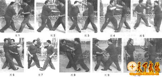对方向我直拳击打上路,我即左顺步钻拳迎击对方来势,着力内旋拿腕,右脚跟进,右手同时向对方肋部击去。对方另一手还击,我即左脚后撤,缩身避开对方拳势,同时右手就势内旋接手拿腕,左手同时向对方肋部击去。对方还手反击,我则后撤步,左手顺势后捋对方之势,左脚右插左拧反身,右手从左肩上向下横压对方反击之势。左脚顺步疾进,左拳直崩对方腹部,右拳向对方面部紧劈,右脚跃起奋进,左脚跟进,右手劈拳要合力挺抖,狠狠极力发放(图1—9)。