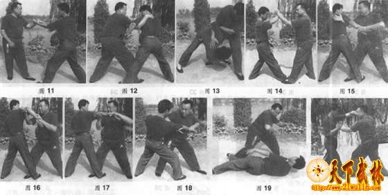 我左脚上步鹞子钻天,以左掌向对方面部直钻,对方上右脚右手格挡,我则即内旋翻手扣腕,抓拿对方右手腕,右脚同时上步,右手同时在左手拿腕之机向对方肘下插入外旋,膀摧臂向右后涌把对方肩掖上挂,对方受力化解卸力,我即左手压对方手腕,右臂内旋向上别对方之肘,身体左转拧身,右脚后撑,臂合力顺势左横,右肘同时沉靠对方胸腹,并扩肘拦挡对方另一手反击,使对方仰面后跌(图14—19)。