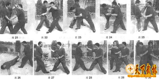 对方左手进击,我即以右手向后横扩,左手入进外旋以小臂横击对方胸腹。对方右手反击,我左手顺势内旋向左横扩肘,右手同时就势从对方臂上内旋缠臂向左下绕,右肩同时向对方胸部撞击。上势不停右脚上步,左手拿腕向左后拽,随即右手向下,身体随臂下俯,同时右手内旋将对方右腿向后撩挂,全身随即向左合力浑然左拧,将对方向左前方摔出。或者用右手压膝侧关节,坐髋下沉使对方跪摔(图20—26)。注意上步挂腿要迅速,形随意转,肩靠顶压胸腹要准确协调,绕臂要用内劲,操作快速敏捷。