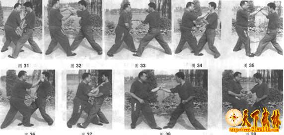 我以右势站立,对方进右步以右拳掼打,我向左跨步闪开对方拳峰,右脚向左脚前上步以右手横拦对方手腕,身体微右转,左手屈肘左横击对方胸肋部。左脚前插置于对方右脚后,转动不停,双手胸前交叉,与对方背靠背,立即腰胯下坐,双肘后顶。上动不停继续右转,左手从右肩上向下压对方反击之势,右手从左臂里向前钻击(图27—37)。此技击法特点是:贴身要紧,动作要快,力量充足,转身要敏捷,撞打发力要狠,巧妙灵活,反击要果断疾狠。