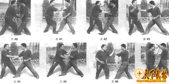 对方快拳进攻,直拳不止,我则以鹞子钻天式,前手顺步下劈连捋带压对方之手,后拳外旋顺步上钻对方头部要害部位,后手即钻即翻内旋就势下劈;另手再钻再劈,左右交替。顺步跃起,左右掉步,前脚纵进,后脚跟进而落,跃起下劈压,一纵而起顺步而落,一劈一钻连环进击(图43—46)。