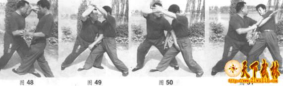 对方来势凶猛,我则左脚向前,身体左移,右手随身体左移同时从右向左、拳心向左向下扣压对方来势,左肩随即向左靠撞对方,左拳同时从右臂里向左以仰拳上钻,使对方五官受损;对方迎架或反击,我即右手从左肘下向右横撑对方上肢,左手即内旋下反手以指裆捶向对方阴部撩打,着力即翻,向上挑裆(图47—51)。注意下钻击裆身体右俯回头看左手,挑裆着力,同时抬头注视右手擒腕。左手挑肘,两腿微屈成半马步下蹲,挑裆采用抖旋,用腰劲转抖带动四肢浑然连贯,手到眼到,一气呵成。