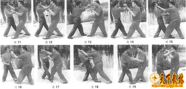 对方左手向我面部击来,我即左脚左横移,右手向右横钻迎击,着力向右后横领化解,右脚跟进,右手内旋翻转以阳拳向对方面部直崩,左手护于胸前。对方另一手反击,我即以左手从右臂下向左横钻,着力后领翻转拧腕以阳拳向对方面部直崩,同时右脚顺进,右手护于胸前。对方另一手迎架,我即着力顺势下捋刁拿其手腕,右手顺势托对方肘关节,同时右腿提膝顶裆、右手屈肘向右横靠肘,右脚落于对方下肢侧控制其下肢,向右拧腰涌身抖撞,使对方跌倒(图13—18)。