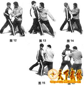 我仍以轻步站对敌。对方突发右拳击我,我速用左手向外划拨,同时进右步,用右肘摆击其脸侧(如图11)。接着我右脚再快速前进,左脚紧跟,右肘快速向下往其胸前划击(如图12)。对方因连连受挫而极欲脱身,我粘住紧随,右脚再迅速向前进步,抬右肘以剑出鞘式顶击其下颌(如图13)。