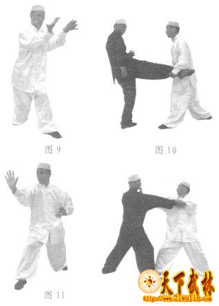 敌如用脚击我上部,我用前手搬敌脚的同时,上后脚进身用后手击敌前胸,敌必倒地。(如图10)