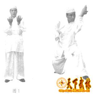 1、盘法:承上势,以头领身,上左脚半步,随上右脚过左脚一大步的同时,左手后拽,右手从后向前推出,步呈半马步。目前视,三尖照,六合合。(如图1 3)