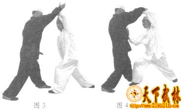 2、功用:如有人用有拳击我前胸,我用左手外斜搠化敌击,随进步用右掌击敌胸。(如图3、4)