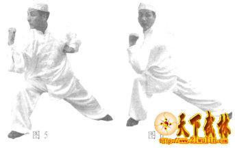 承上势,以头领身,重心前移;上右脚向正北方一步,随追蹬左脚半步,呈前膝弯套后膝弯的弯套弯步,在上步的同时,右肘从下向上领起,随向下崩出,左手同时从前上向后下捋、拽、按到裆前,肩必内扣,五指朝下,掌心朝内,双手在撕时如撕牛皮筋一般。头顶颈直,目前视,三尖照,六合合。(如图7)