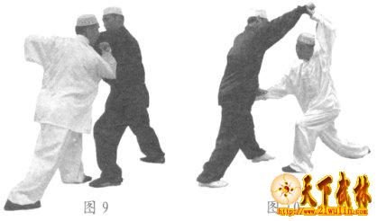 敌如用右脚击我,我左肩变右肩,右肩变左肩,于化敌之击的同时,上右脚踩敌中门,右肘从上向下砸击敌裆。敌如退步化我之击,我随上右脚过左脚,右肘击敌胁,两脚进步,连环两手击敌,或变劲上崩敌胸的变劲不变招的妙用。(如图8、9、10)