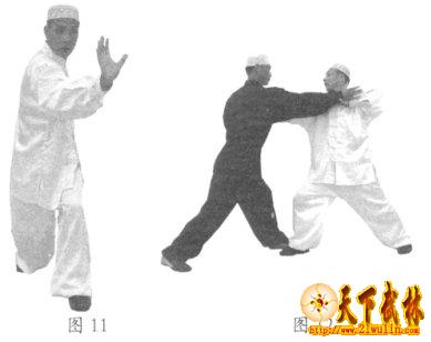 1、盘法:承上势, 以头领身,重心前移,上左脚过右脚一步,随追蹬右脚半步,呈前膝弯套后膝弯的弯套弯步,在上步的同时,右手向斜锁出,左手后拉,肩必内扣,头顶颈直,目前视,三尖照,六六合。(如图11)