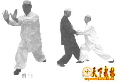 2、功用:如有人用右拳击我前胸,我进左脚踩敌中门,用左掌一翻化敌击,随进步用右拳推击敌胸。(如图14)