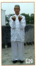 双手从身体两侧向上捧到胸前,掌心肘心向上,十指平心,沉肩,此为伊斯兰教的“接嘟哇”,意为真心诚意接受真主的恩赏之意。(图1)