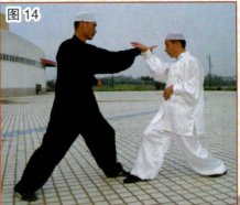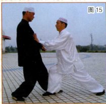 敌如左击我上盘,我右手外化敌,一转手翻掌用双把击敌前胸。(图14、15)