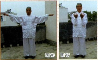 收势用“接嘟哇”承上势凤凰展翅,双手从身体两侧向上捧到胸前,掌心肘心向上,十指平心,沉肩,此为伊斯兰教的“接嘟哇”,意为真心诚意接受真主的恩赏之意。(图17)