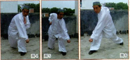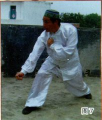 承上势抱把,以头领身,左脚向前上半步,随追蹬右脚半步成弯套弯步鸡步;上步同时右手向前栽出,左手向左撕拽到左胯,左右手互换连环栽出拉回背部有开合之劲为要,目前视,三尖照,六合合。左右步和左右手互换连环栽出拉回。(图4、5、6、7)