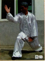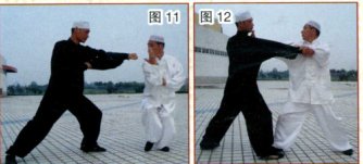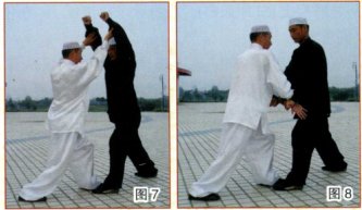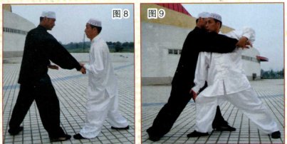 敌如用f前拳击我上部,我左手内裹化敌之击,右手栽击敌裆。(图8、9)