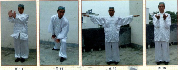 1、盘法,2、呼吸之法,3劲意.4功用同前凤凰展翅略。(图13、14、15、16)。