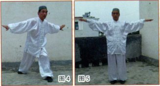 头领身以身带步,以身催手,双手在先在面向内划园圈,随向左右两边划立园罔展开如同凤凰展翅一合一展的劲意,故此把称凤凰展翅。