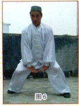 承上势“接嘟哇”,吸气提肛收腹,同时双手向内拧成掌心向下划园圈,双肩下沉,含胸拨背,五指向前下按,双脚跟离地,脊椎正直,头向上顶与双手下按成脊柱上下二争劲;头顶到不能在顶时呼气,上右脚一步,同时双手翻拧成掌心向上从腹前向身体左右两边划立园圈托起展开,随上左脚过右脚一步成马步,同时双手翻拧按成掌心向下按劲到裆前,目前视。(图2、3、4、5、6).