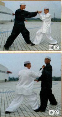 敌右拳击我上部,我左手化用,随右脚踩敌中门,右拳钻击敌下巴。(图10、11)
