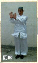 承上势抱把,以头领身,上左脚过右一大步,接着上右脚并左脚,在上步同时双手从胸向前上钻拧,成掌心向前,五指向上推出,两肘相向裹劲,头顶项竖,下颌内收,目前视,三尖照,六合合。(图12)