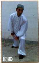 承上势,上左脚向前踩出成左弓步,右脚在后,足跟落地,向前支撑蹬直,从头到后脚成一笔挺的倾斜直线,两腿在一条直线上,此为心意六合拳的牮柱步。前脚有“脚打踩意不落空”,后脚有“机巧全在后脚蹬”,犹如墙快倒时,用以长木头以斜着支撑墙壁之意,故称牮柱步;上步同时双手从上向后下拽按,成五指向前,掌心向下,到裆前,双手向后下拽按,与头前顶领成对争之劲,下颌内收,目前视,三尖照,六合合。(图13)