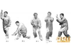一、龙形 一波未定一波生,好似神龙水上行,猛然一惊冲天起,生光雄勇令人惊。 起势:两腿并立,目视前方。 第一动:左脚向前迈进一步,双腿弯曲,右手曲肘上钻,手心向面;左臂曲肘下按,手心朝下贴于左胯外侧(图1)。 接上动,右脚向前迈进一步,双腿弯曲,左腿蹬劲,