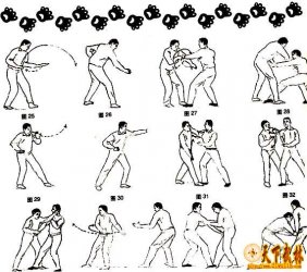 摔、打、踢、拿,是武术最基本的四大技法。擒拿是其中之一。迷踪拳是以技击实战著称于世的,擒拿术的内容也比较丰富、系统、全面,主要有抓拿法、打拿法、摔拿法等。在这里,介绍抓拿法八式。 一、前抓脖拿(肩) 1、双方对峙站立,对方左脚向前上步,用双手向前掐住我