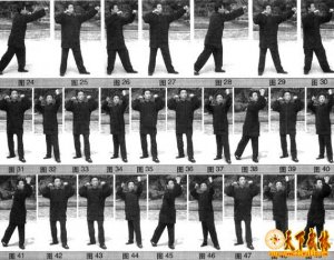 24式之捋肘 演练方法:以左格斗式预备,左脚向前活步,左拳变掌外捋,右拳自然下垂于身后;(图38)右脚向前上步,左掌变拳后盘肘于左胸前,同时右掌里捋变拳盘肘于胸前;(图39)右脚外撇,左脚上步,同时右拳变掌外捋;(图40)左脚落实,右掌变拳盘肘于右胸前,左掌