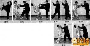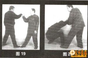 七、鹞形拳散打应用 (一)过背摔(鹞子翻身一) 对方对峙,我与对方活步三体式迂,对方以左拳直击我上路,向我头部攻来;我即用右小臂外旋上钻拦挡,即粘内翻,顺势抓握对方左手腕,同时右脚上步,左脚插步上至对方左腿前,双脚左右平行拉开,两膝微屈,同时左臂向右夹抱,