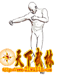 以上勢將右足踏實,既向右方騰開一步,同時將全身移向右斜前方,足成右斜弓步此時雙手掌心下按,然後翻掌向上,猛力向上托去。