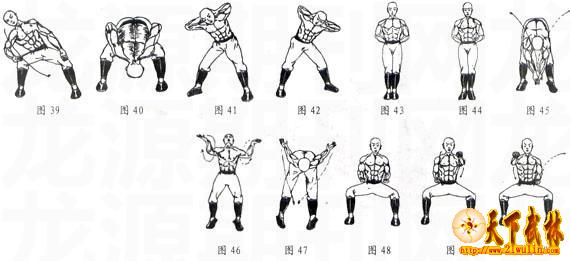 继向右侧下屈(如图39所示)。紧接着,上体和头部自右侧向前转,并俯身下躬,两腿马步不变(如图40所示)。