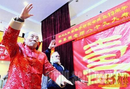 据介绍,作为杨氏太极拳第五代传人,89岁的林老在同辈中造诣颇深。目前,他任四川太极拳推手研究会会长、中国永年国际太极拳联谊会副理事长,收有入室弟子数百人,徒子徒孙上万。为恭贺他寿辰,上百弟子特地从全国各地赶来,峨眉和青城等五六个武术门派的代表也赶来参加,“这是四川每年一度的武林盛事”。据了解,林老与奥运渊源颇深,中国武协曾推荐他为2008年奥运会太极功夫形象大使。