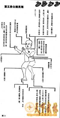 何谓白鹅亮翅?如白鹅之鸟舒展羽翼,象形也。以右手领住左手,先下降至左胁前,去胁七八寸许,先绕一圈毕,再以左手领住。右手斜势,由下逆行而上向右边去,只绕大半个圈,如鹅展翅之形,似停不停。右足向右行,亦绕大半个圈开步约一尺有余,右足趾向北,平实踏地;左足随右足行到右足边,脚趾点立于地,亦伏下势开步之易,左足虚,右足实,中间胸向北西(解见前)。胸中内劲如太和,元气旋转先自右向下向左逆行而上,从左而右转够一圈,与手足一齐停止。右手过首在右,距右耳尺许;左手随右手运行至鼻前,左手斜朝上,去脸七八寸许。左手与右手相去一尺余,眼看住两中指,顶领项直,沉肘压肩,胸含住,屈膝开裆。左足虚倒立,右足平踏地。此势虽名为一势,实半势为,其钝是引进落空(去声)意。且尽是开意,无合意,必与下势合成一势,大局方得停住。