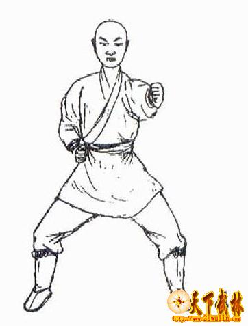两足左右分开,成骑马势,两拳紧握,各置腰际。