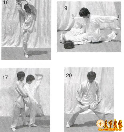 使用时,以正踢腿向后攻击对方头部。这是一种意想不到的打击,会造成对方面部受伤或嘴角流血(图17)。