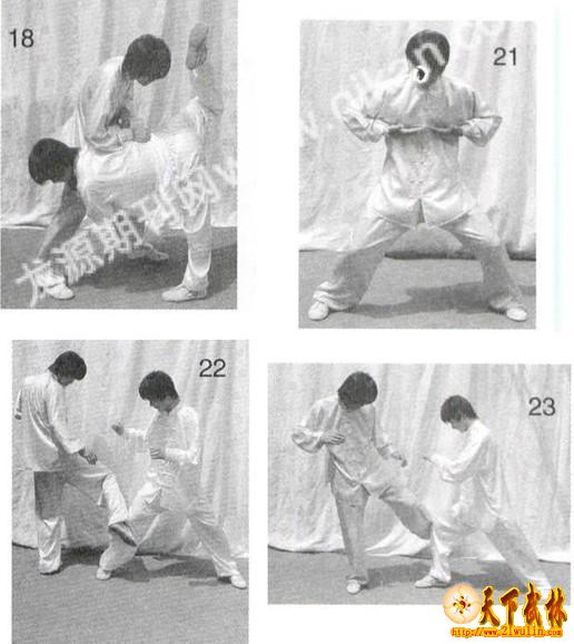使用时,以膝关节向外摆挡防御对方攻击我裆部的腿法(图23)。